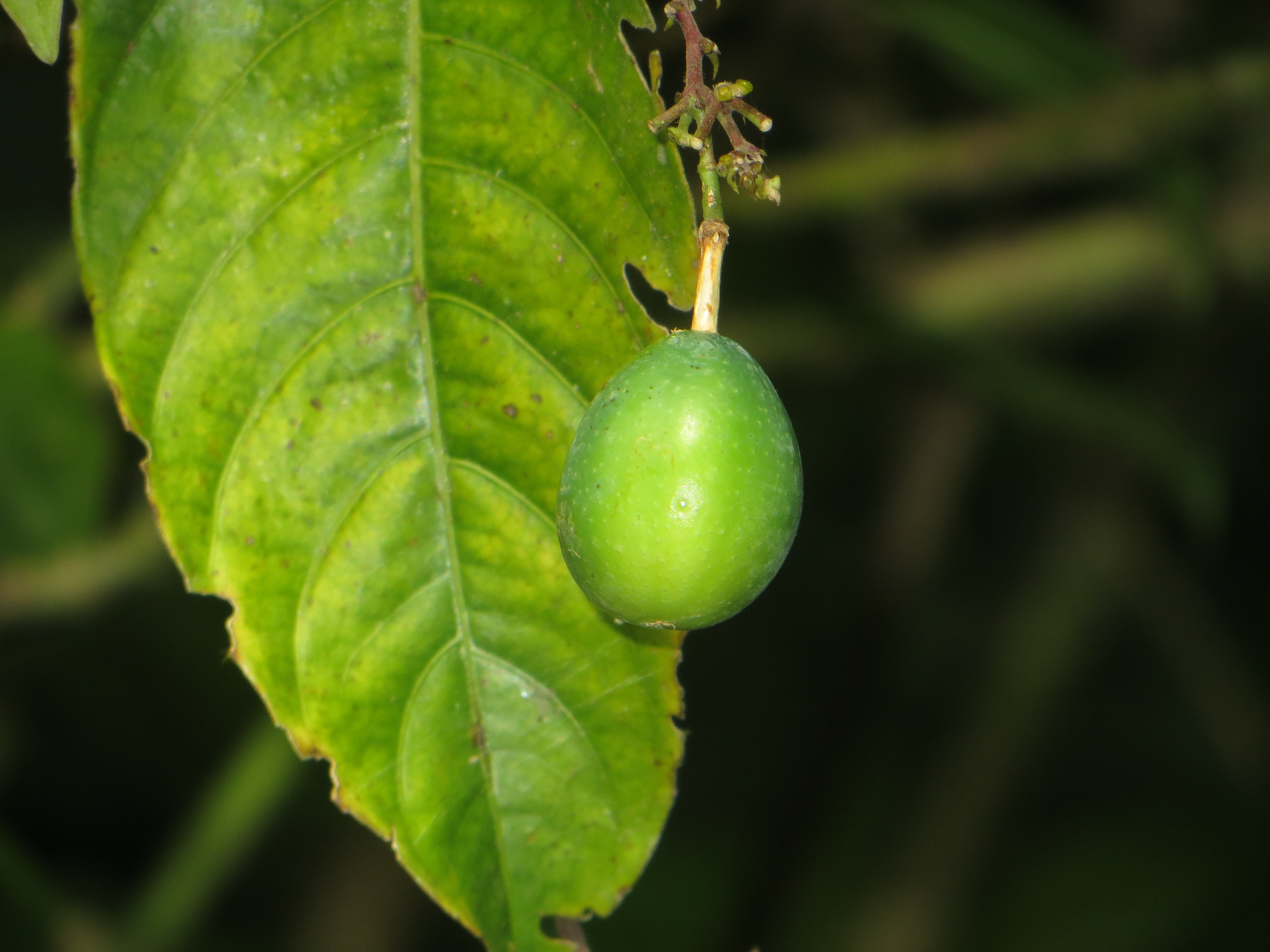 P. megacoriacea is not common at La Selva, and is found mainly in shady older second growth areas and on the edges of clearings. Many plants are found near the banks of the rivers. The leaves of this species are unusually shaped, are thick, peltate and seemingly entire with "drip tips", like P. ambigua and P. pittieri. Like P. biflora, the relatively small flowers and fruits are together in pairs along the stem. Range: Widespead in Costa Rica below 1100 meters elevation, in wet and moist forest edges; also in Panama and NW Colombia. Only recently separated from its sibling species P. coriacea, which is found south to Bolivia. These species are members of section Cieca, subgenus Decaloba, with 17 species mainly in northern mesoamerica and the Caribbean.