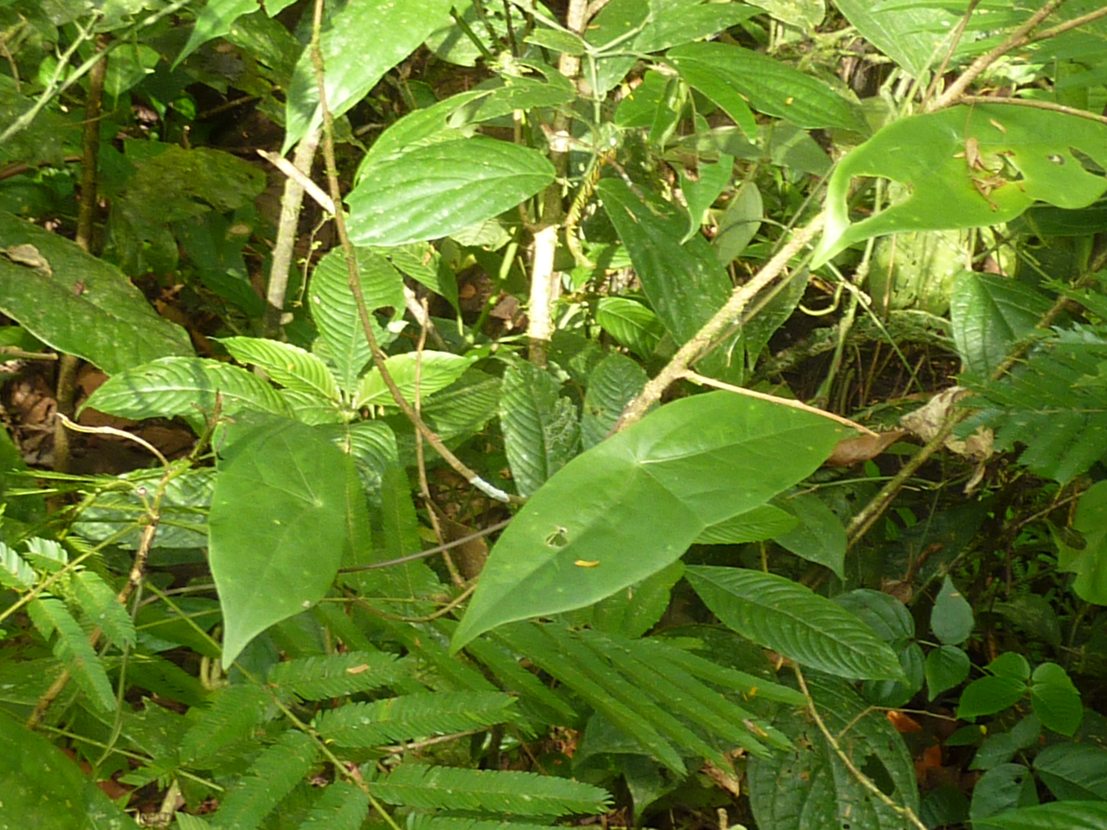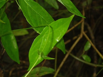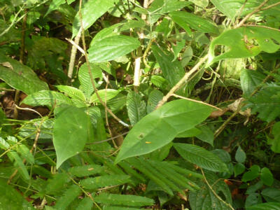 H. cydno and rarely H. erato lay their eggs on P. megacoriacea at La Selva, the former species on the tendril tips and the latter laying her eggs on the shoot tips among the incipient leaves. The growing shoots of this species are not as easily seen as those of most Passiflora species (see photo below). The unusual central petiole attachment breaks up the normal vine appearance, and the leaves seem to "float" unattached to any stem. This may help protect the plant from Heliconius oviposition.