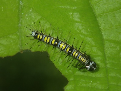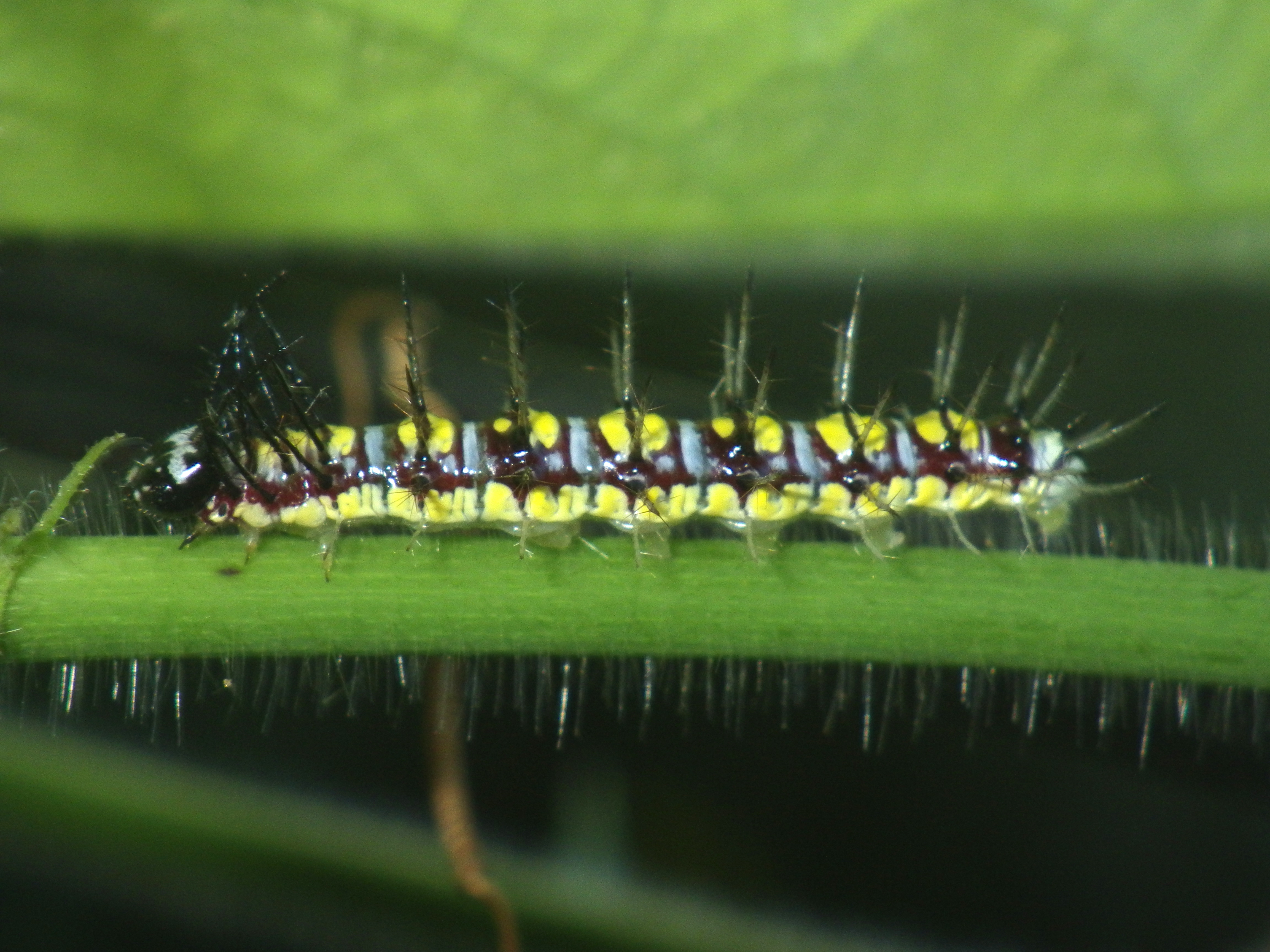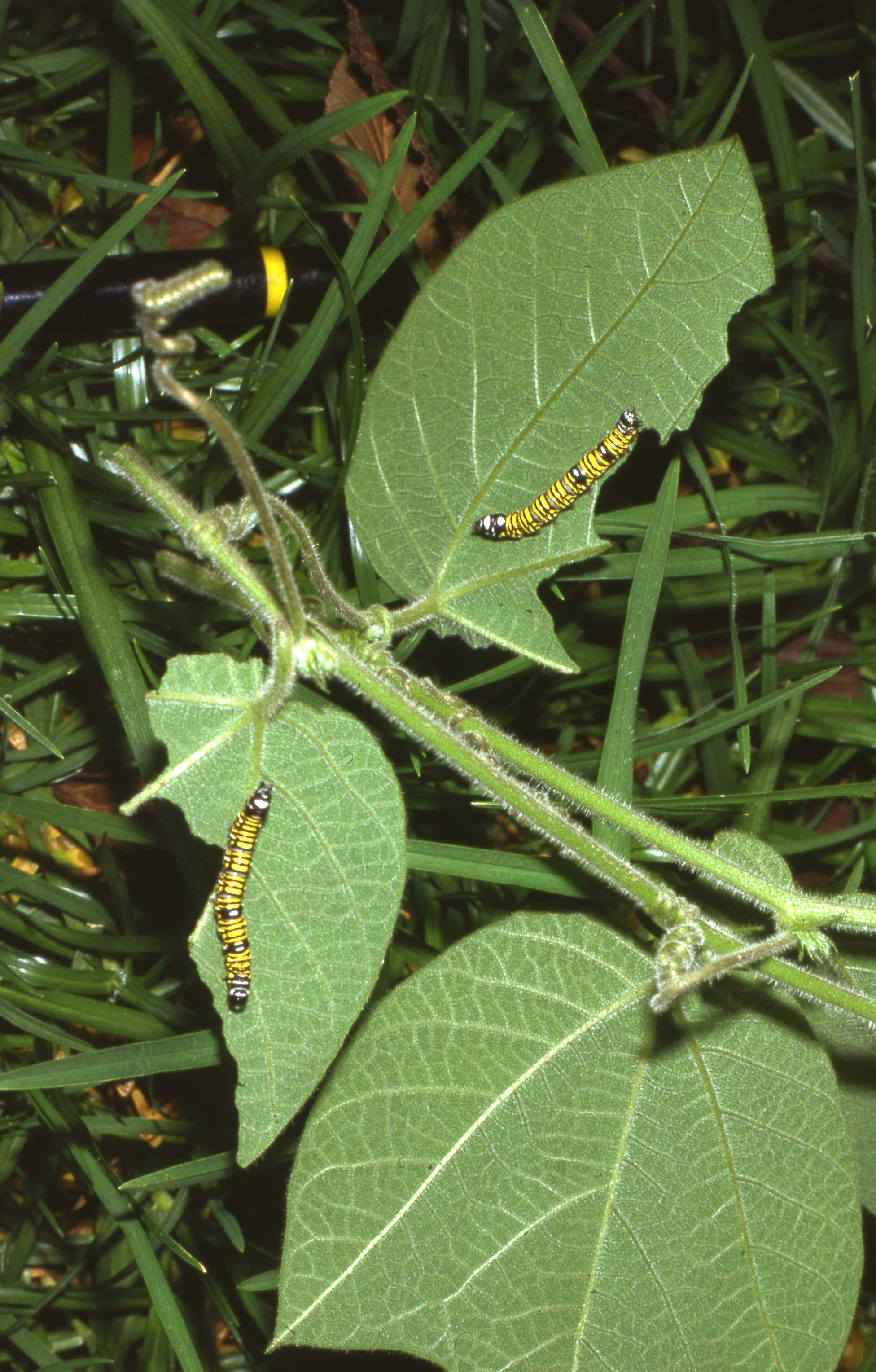 H. cydno, and H. melpomene lay their eggs on P. menispermifolia at La Selva, the former species on the tendril tips and the latter on the shoot tips among the fuzzy incipient leaves or on the leaf blade. The latter behavior may protect the eggs by hiding them from the egg parasitoids, as has been proposed for P. oerstedii (Smiley 1978). Feeding trials at La Selva indicate that H. hecale larvae die when placed on P. menispermifolia. Another species of Heliconiini (Eueides aliphera) lays her eggs on mature leaf blades of this plant as well as P. costaricensis. The larvae hatch and feed on the under side of the leaves, growing into a caterpillar with multiple transverse bands around each abdominal segment (one blue band and 2 yellow bands, separated by black lines, per segment). Remarkably, the dioptid moth Josia sp. has very similar larvae with blue and yellow bands. At La Selva, Josia larvae may be found rarely, on P. costaricensis only.
