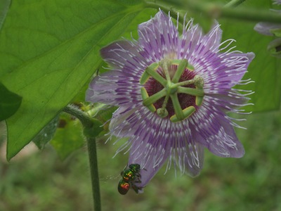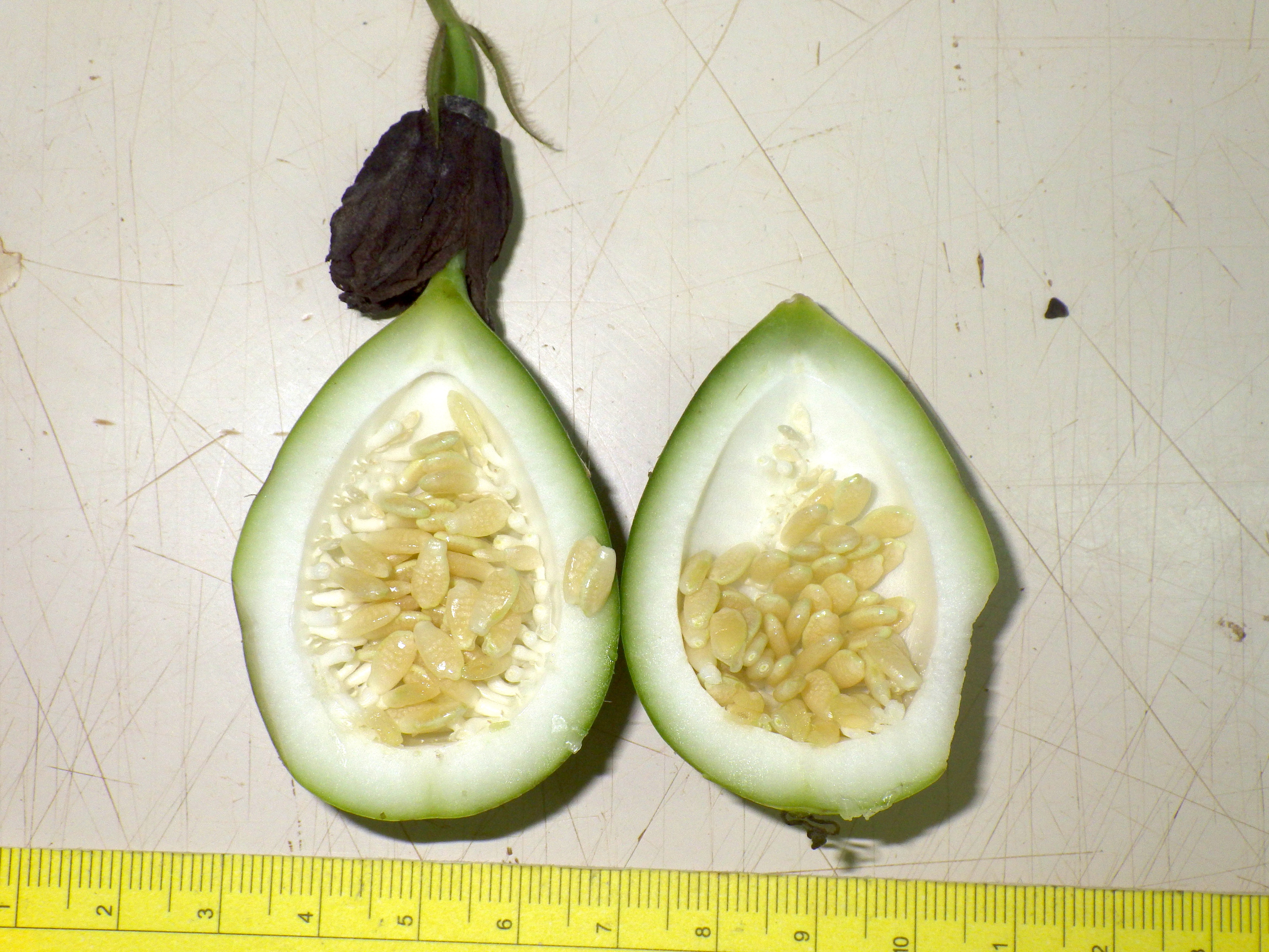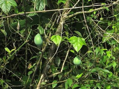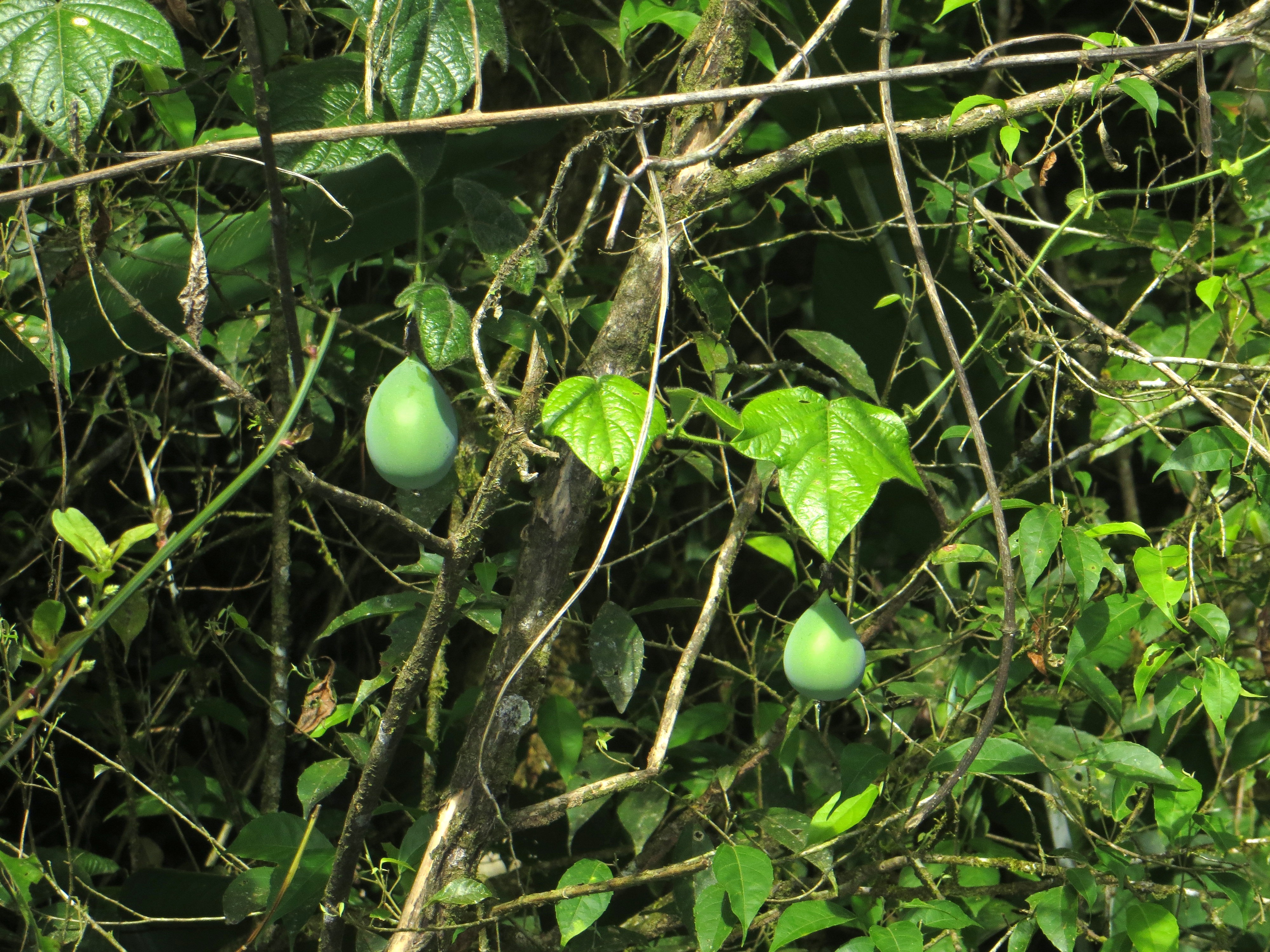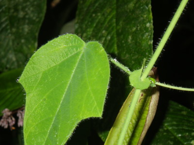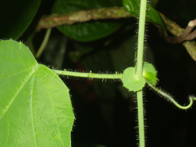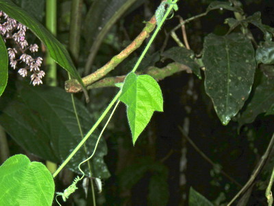 P. menispermifolia is found mainly in second growth areas and on the edges of clearings. The leaves of this species are relatively thick, and are covered with long fine hairs. The petioles bear long stalked nectaries very much like the nectaries of the closely related P. oerstedii, and are probably visited by parasitic hymentoptera such as Trichogramma or scelionid egg parasitoids. P. menispermifolia and P. oerstedii are closely related and belong to Passiflora section Granadillastrum. Range: Nicaragua to Peru, Bolivia and western Brazil. Widespread in Costa Rica in wet forest from 0 to 1200 meters elevation, along roads in secondary forest.