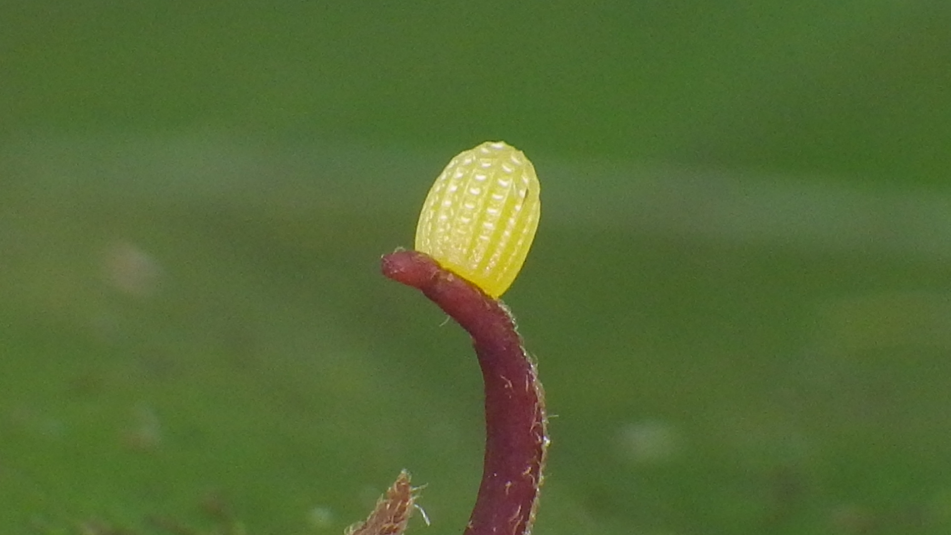 | An H. hecale or H. cydno egg on P. vitifolia tendril. These can't be distinguished from each other until about the third instar, when the spots on the cydno become evident. H. hecale larva don't have spots. |
