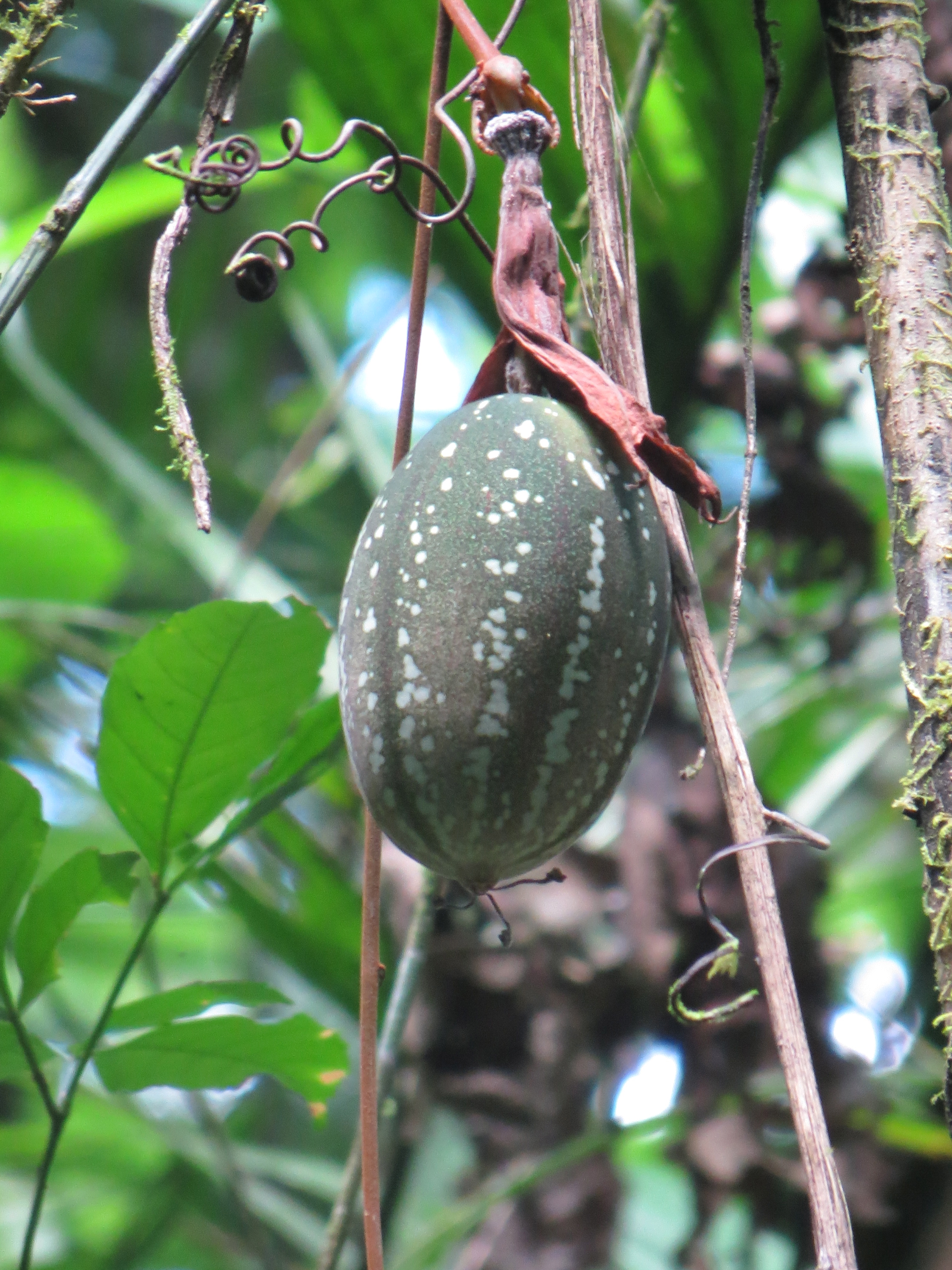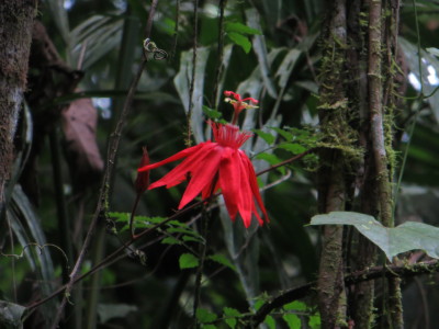 P. vitifolia is a common forest species of Passiflora, often growing in the canopy. However, the bright scarlet flowers bloom in the forest understory and new growth shoots are often to be found at ground level near the flowers, in treefall clearings or forest edge. Interestingly, this species is also common across the artificially maintained successional plots (cut every five years on a rotating schedule), where other forest species P. ambigua, P. pittieri and P. lobata do not thrive. Range: from Nicaragua to Bolivia, Venezuela and Western Brazil; in wet primary or secondary forest and forest edges 0-1500 meters elevation.