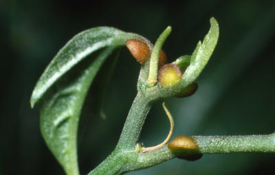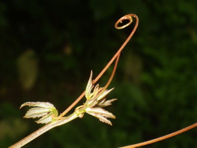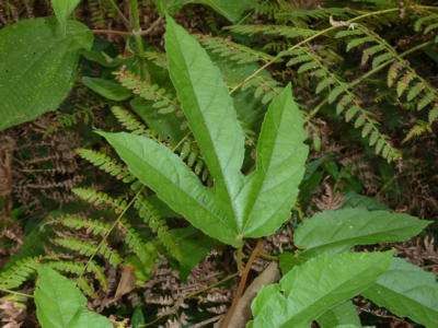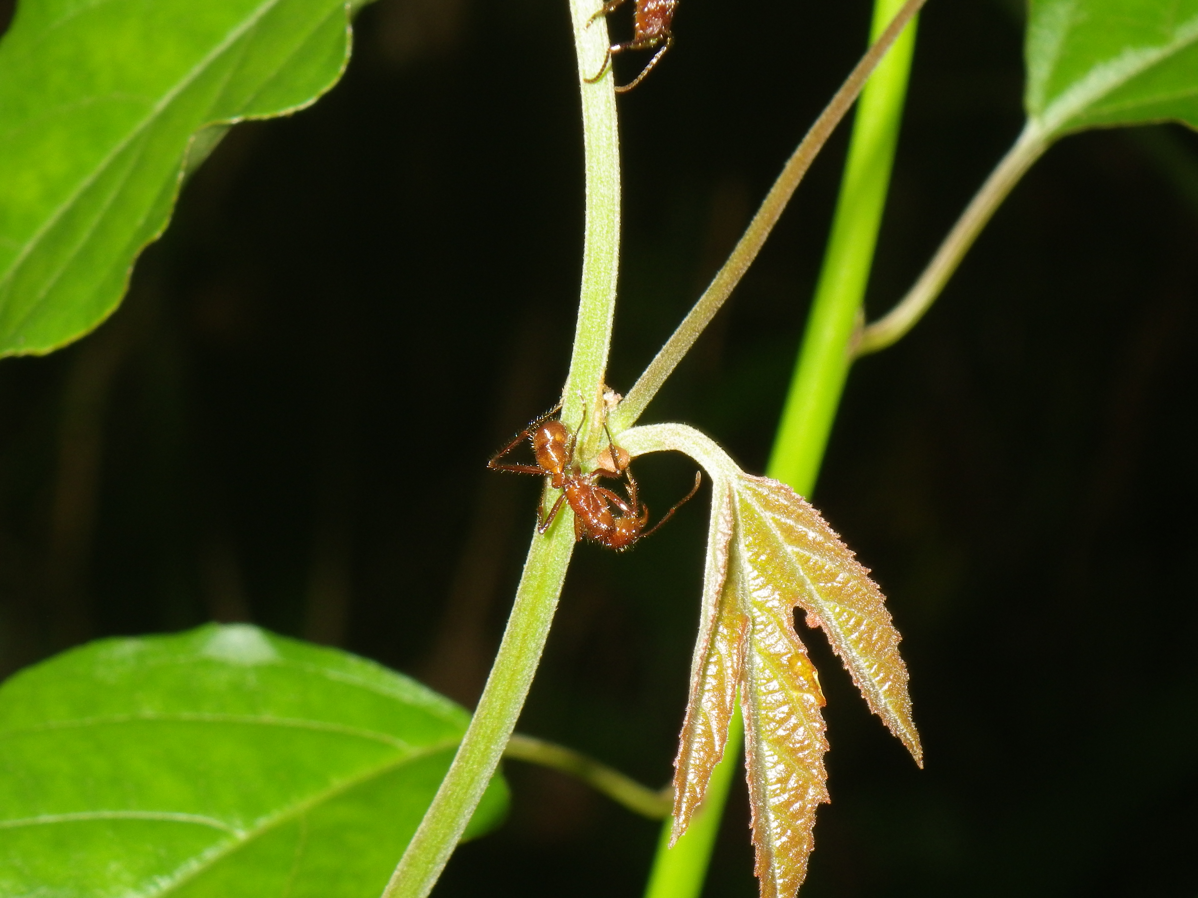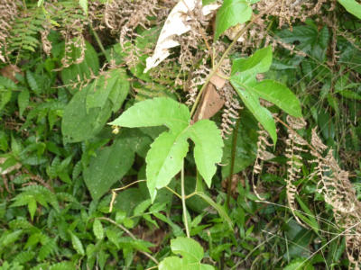 P. vitifolia is the most commonly used host plant for both Heliconius cydno and H. hecale at La Selva, both species laying their eggs on the tips of the new, uncoiled tendrils. H. melpomene is also quite capable of feeding and growing on P. vitifolia, even though it is not found on that species in nature. The large ear-like petiolar nectaries are very attractive to ants such as Ectatomma, and plants which are regularly tended by these ants seem to be quite well-protected against Heliconius caterpillars (Smiley 1986).